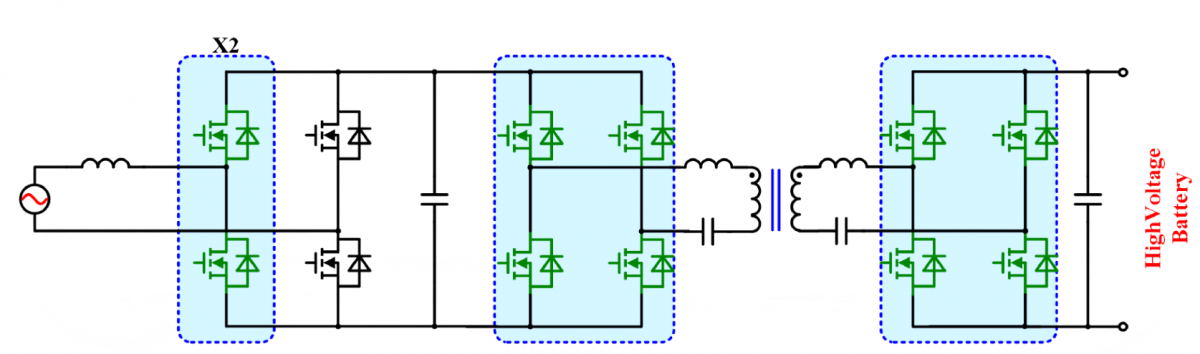 车载充电器(OBC)是安装在车辆内部的系统,用于车辆停放时从交流电网为高压电池充电。OBC通常由PFC(功率因素矫正电路)和DC/DC两级构成:PFC级:为并网的AC/DC变换器,将输入的单相/三相交流电变换为直流母线电压。中国单相交流电桩更普遍,欧洲等国外三相交流电更主流。单相交流输入PFC输出直流母线电压通常为400~600V,三相输入PFC输出直流母线电压通常为700~1000V;DC/DC变换器级:由于单级PFC输出直流电流有比较大低频波动,所以典型OBC会在PFC级后加入DC/DC,输出给车载高压动力电池供电。对于常见的400V或800V电池系统,OBC输出电压通常为230~450V与450~900V。